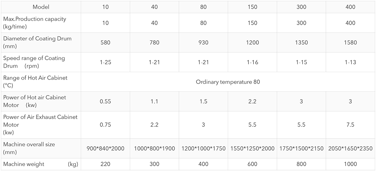 It is kind of equipment integrating elegance, high efficiency, energy-saving, safety, easy to clean, which is applied for coating traditional Chinese and Western tablets and pills(including micro-pills, small pills, water-soluble film pills, drip pills and granulated pills)with sugar, organic film, water soluble film, slow and controlled release film in the fields of pharmacy, food and biology etc. The machine is equipped with the programmable PLC(machine and person interface), with which its operation process and process parameters such as negative pressure and temperature can be automatically controlled. It is easy to operate, with reasonable and advanced process during run of the machine.